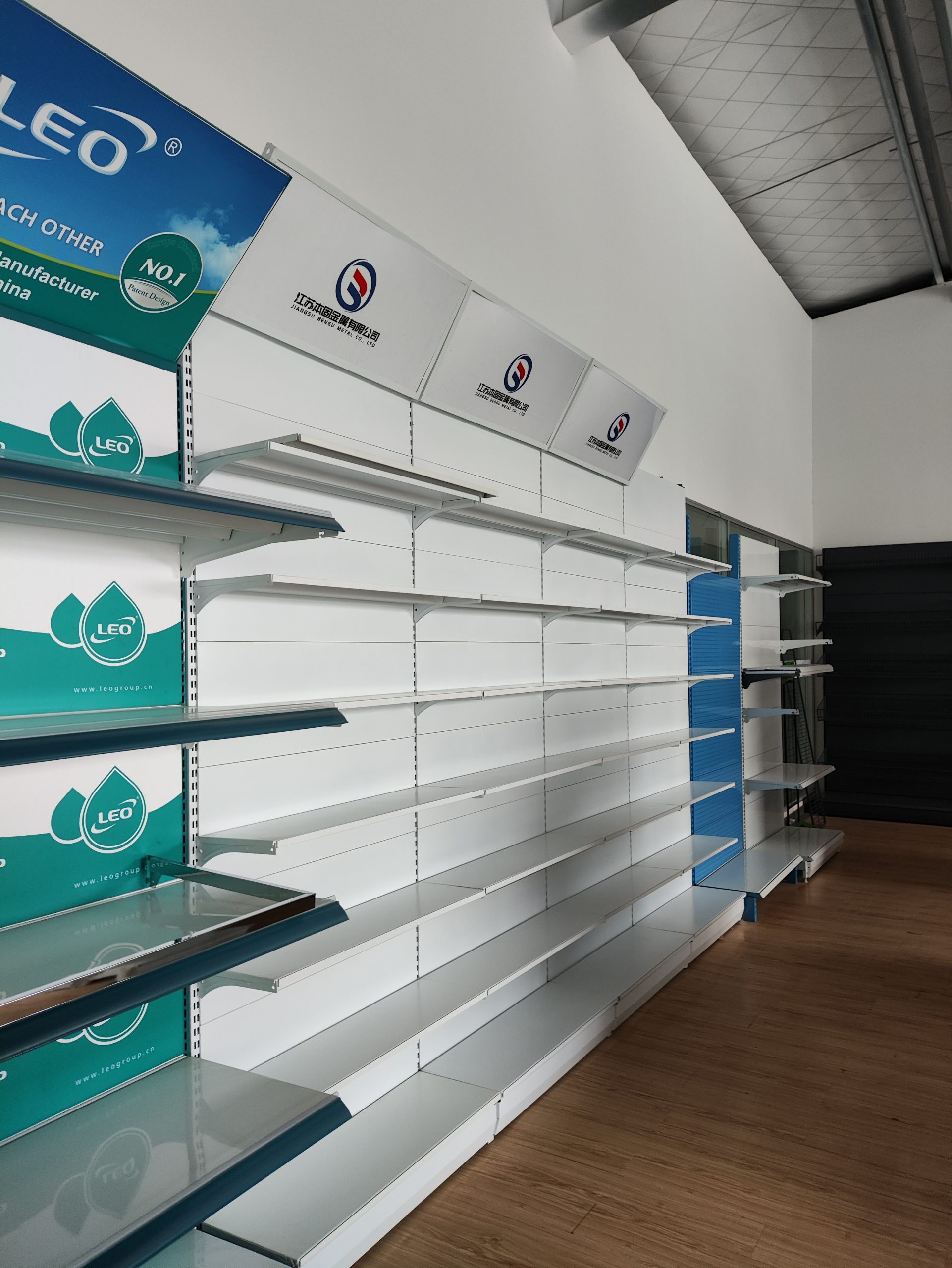 The four-column wood grain shelf they are watching is one of our best-selling products.